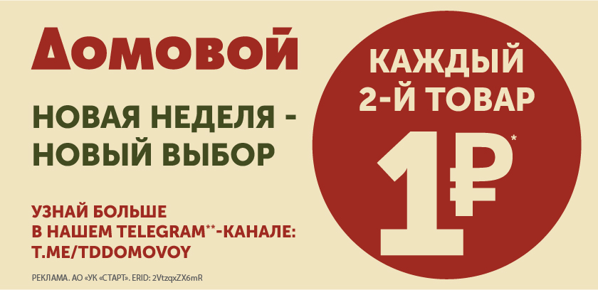 *Акция проходит во всех магазинах «Домовой» c 11.09.2025 г. по 06.10.2025 г. при предъявлении дисконтной карты «Домовой». Акция распространяется на товары из категории «Посуда», «Текстиль», «Декор», «Светильники», «Для дачи и отдыха», при этом за 1 рубль идет товар с наименьшей ценой. Акции между собой не суммируются. Предложение не распространяется на заказы в оптовом отделе, товары, приобретаемые по предварительной купле-продаже, через интернет-магазины и маркетплейсы, не действуют скидки по дисконтным картам и купонам. Цены на представленные товары действуют только при наличии дисконтной карты.
