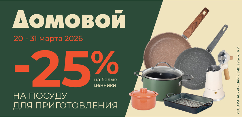 * Скидка действует с 20.03.2026г. по 31.03.2026 г. в розничных магазинах «Домовой» на посуду для приготовления с белыми ценниками по купону с предъявлением дисконтной карты «Домовой». Скидка не распространяется на жёлтые и красные ценники, товары ТМ «ДОМОЙ», товары с пометкой «уценка», заказы в оптовом отделе, товары, приобретаемые по предварительной купле-продаже, через интернет-магазины и маркетплейсы, на приобретение подарочных сертификатов (карт), не суммируется со скидками по картам, другим купонам и акциям.